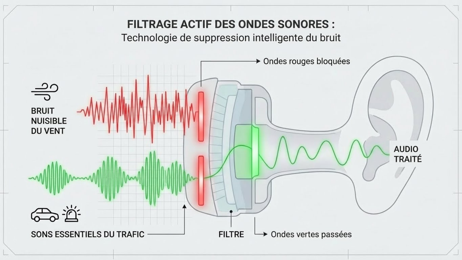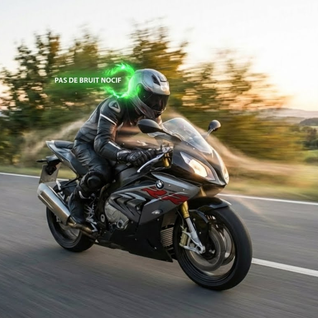 🌙 Un système de filtration acoustique laisse passer les sons essentiels (klaxons, moteurs) et atténue les fréquences nocives du vent. Vous entendez moins, mais vous entendez mieux.